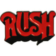This Rush Red And Black Logo enamel pin measures 1.25 x 0.75 inches. Comes on a retail ready display card.